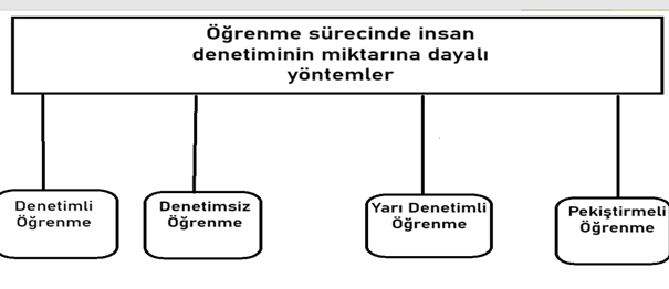 Yarı denetimli makine öğrenmede ise hem etiketli hem de etiketsiz verilerle sınıflandırma, regresyon ya da kümeleme işlemleri yerine getirilebilir. (GÖREV VE VERİ ODAKLIDIR ETİKETLİ ETİKETSİZ)