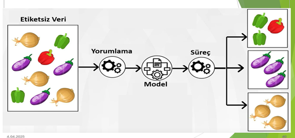Verilerde hangi kategoriye ait oldukları belirtilmemiştir. Model, veriyi gruplamaya çalışır.