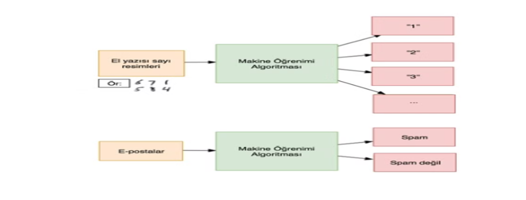 - Bir e-posta uygulaması, gelen e-postaları “spam” ya da “ham” olarak sınıflandırmak için bir model kullanabilir. Bu durumda, her e-posta ya spam ya da ham (istenmeyen ya da istenen) olarak etiketlenir.