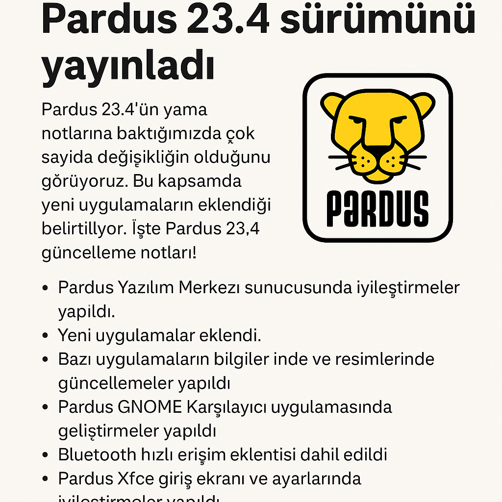 Pardus 23.4 güncellemesini hemen indirerek deneyimlemeye başlayabilirsiniz. Unutmayın, Pardus sadece bir işletim sistemi değil; aynı zamanda yerli yazılım ekosistemine yapılan bir katkıdır.